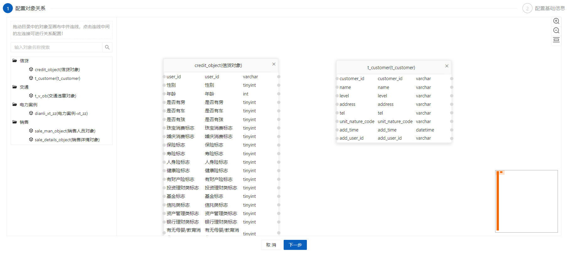 - 在关系图画布页面,从左侧对象列表中拖动需要建立关系的对象到右侧视图中。