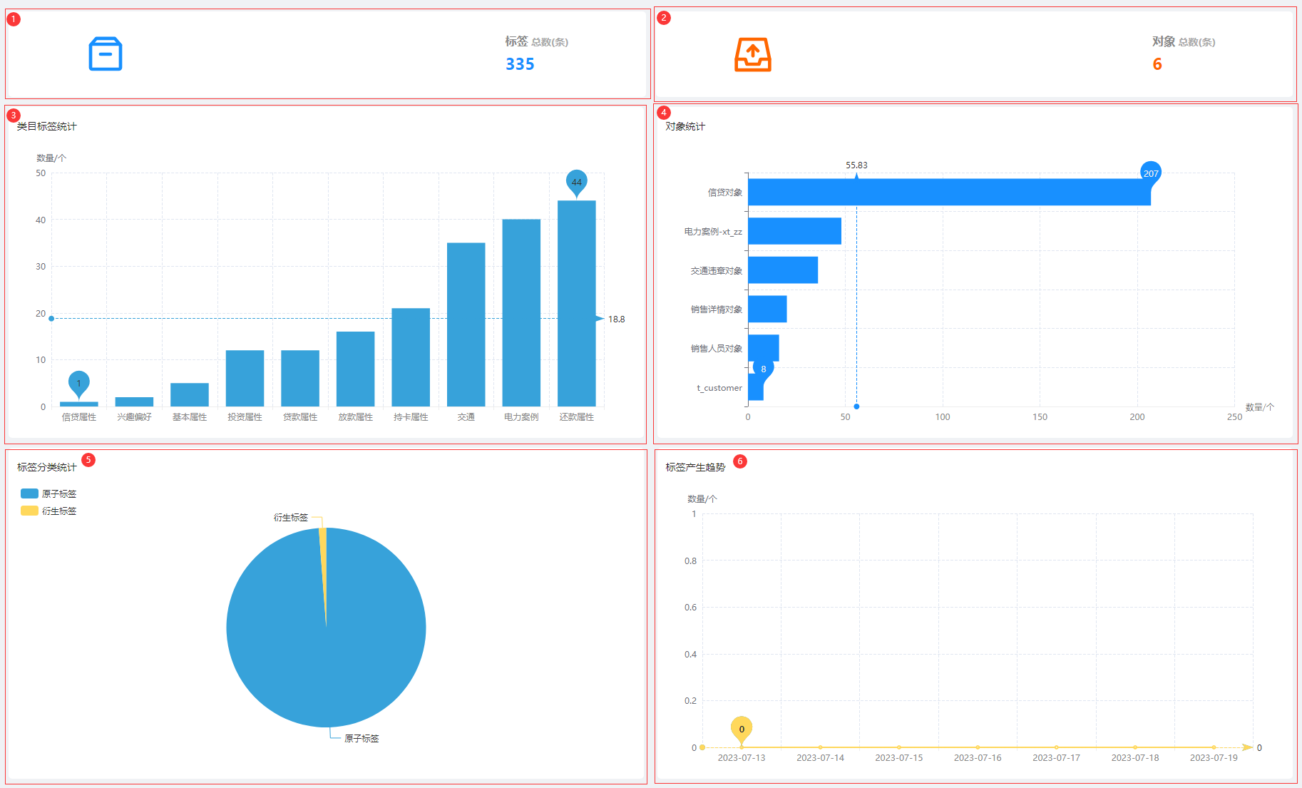 | 6 | 标签生产趋势 | 查看各时间点(按天)生成的原生和衍生标签数量,了解业务需求的密集区间,分析业务的淡旺季。 |
